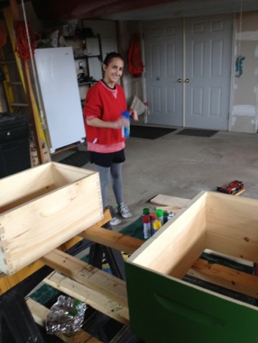 A quick diversion: During a short trip home, my father, a beekeeper for as long as I can remember, decided it was time to try something new with his hives to see if he could get them to last through the winter. This year, we’re adding color! The thought is that darkly colored hives, instead of the standard clean white, would absorb more of the sun’s heat during the long Maine winters, giving the bees that extra edge they needed.