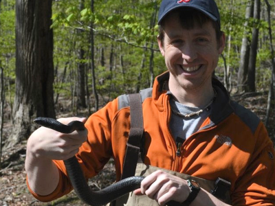 I went out again to help with a friend’s research (the same friend as before) and we found this Black Racer (Coluber constrictor) sunning itself on a rocky outcropping. It was a beautiful old snake about 4.5 feet in length! After a bit of protestation while it was on the ground, it was mellow as can be in-hand (hence the lax handling in the photo; it’s much more secure to handle a wild-caught snake closer to the head so he doesn’t have quite so much leeway to chew on you). That day we were scouting for potential frog ponds, and though we struck out, any day finding a big snake is a good day.