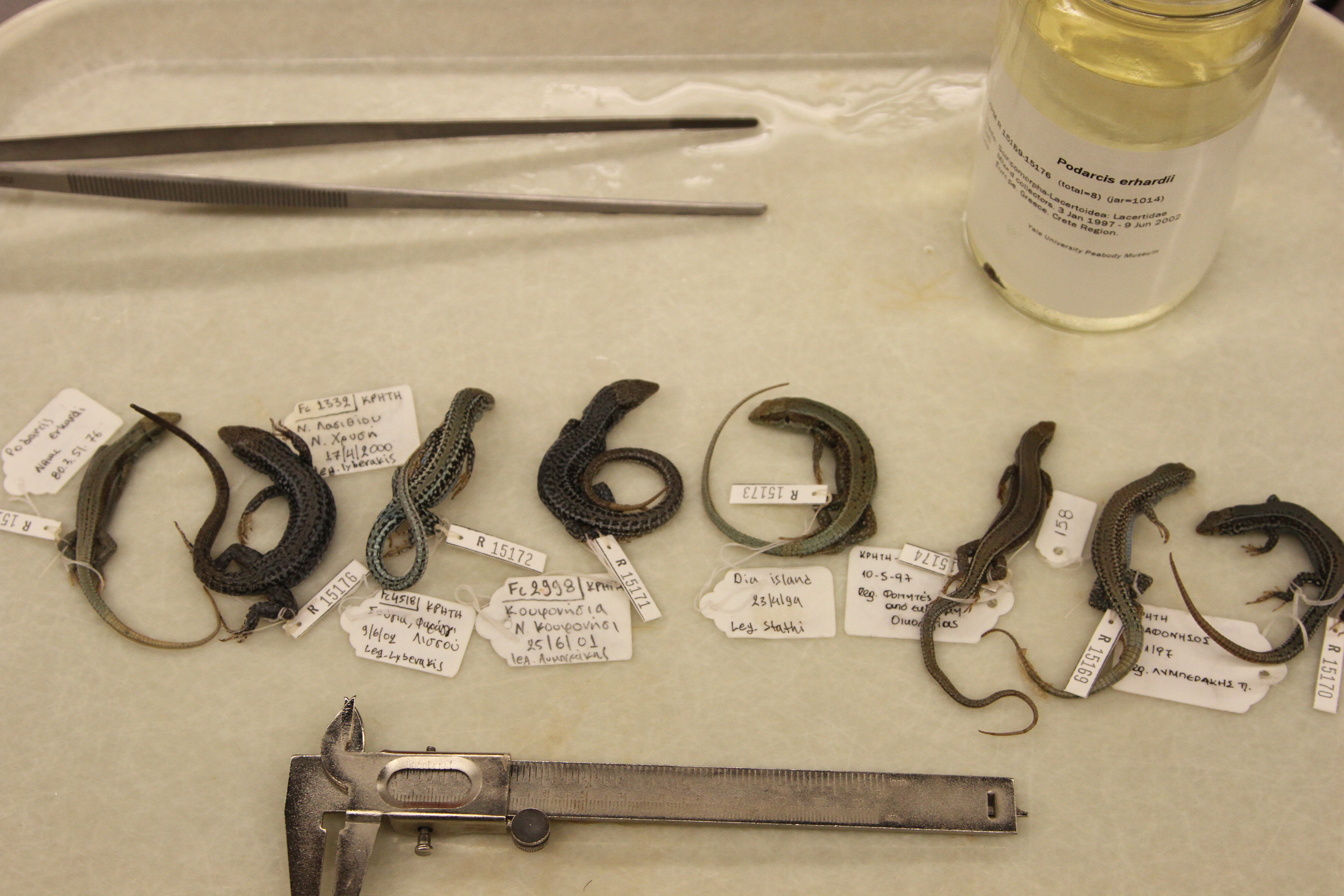 The first step to figuring out if the physical appearance of these lizards do indeed change according to their ecological context was to visit natural history museums, looking for patterns in preserved specimens. After a bit of searching, I found that Yale, Harvard and the American Museum of Natural History in NYC all had preserved samples of Podarcis erhardii. The next step was visiting the museums to take a look at their lizards.