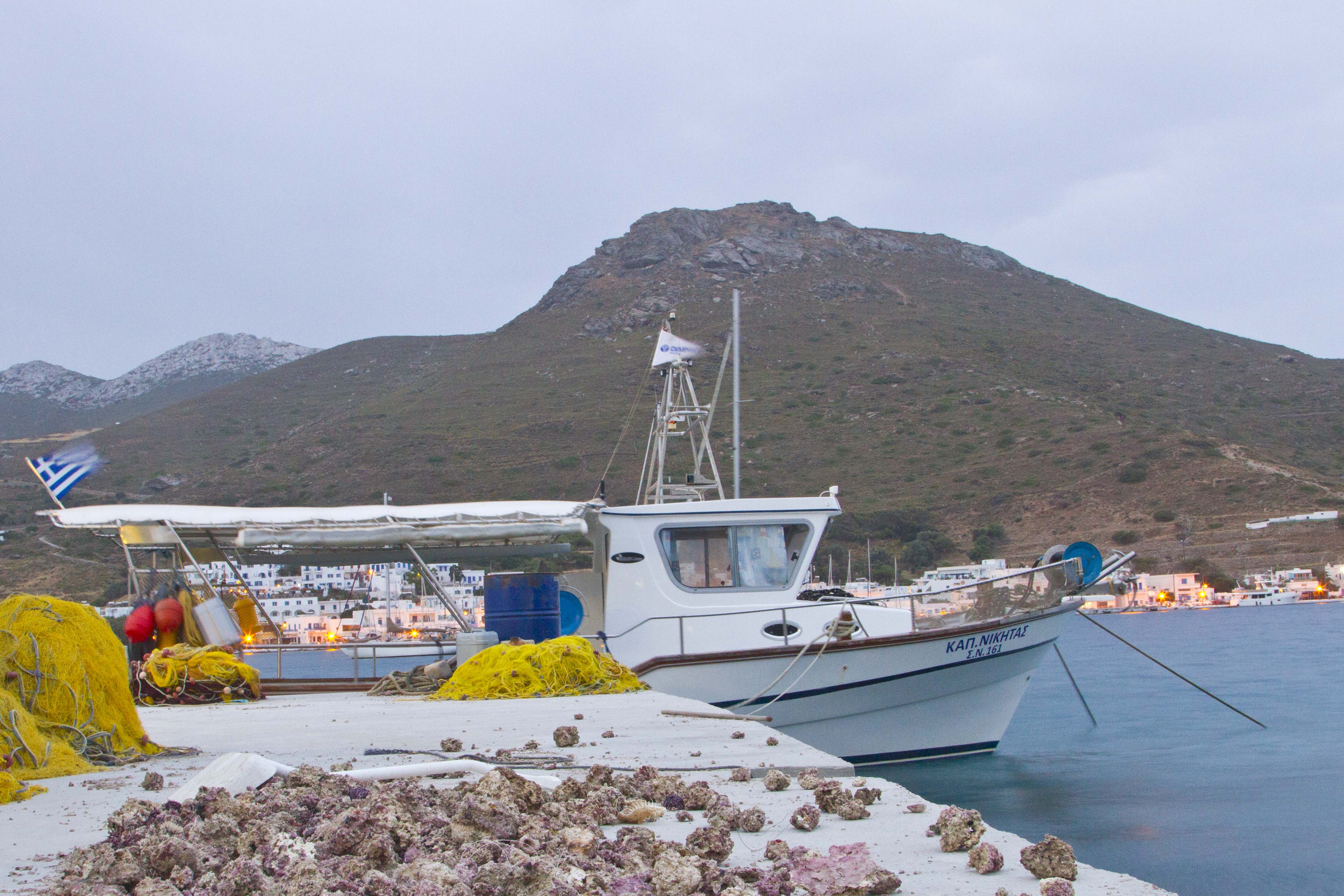 As I alluded to in my last post, I went out with the fisherman the next morning to help him pull in nets. It turns out he and his hired hand had the work well in order, but I still got to take some cool pictures and get an inside look at fishing in Greece. It was a pretty awesome experience. We set out at 6:00 am just as the sun was coming up. The wind was strong and the waves were as tall as me (over six feet peak to trough). No seats on the deck of this utilitarian fishing boat, so I was bracing against the impact of every wave trying to keep my camera rolling and gear dry.