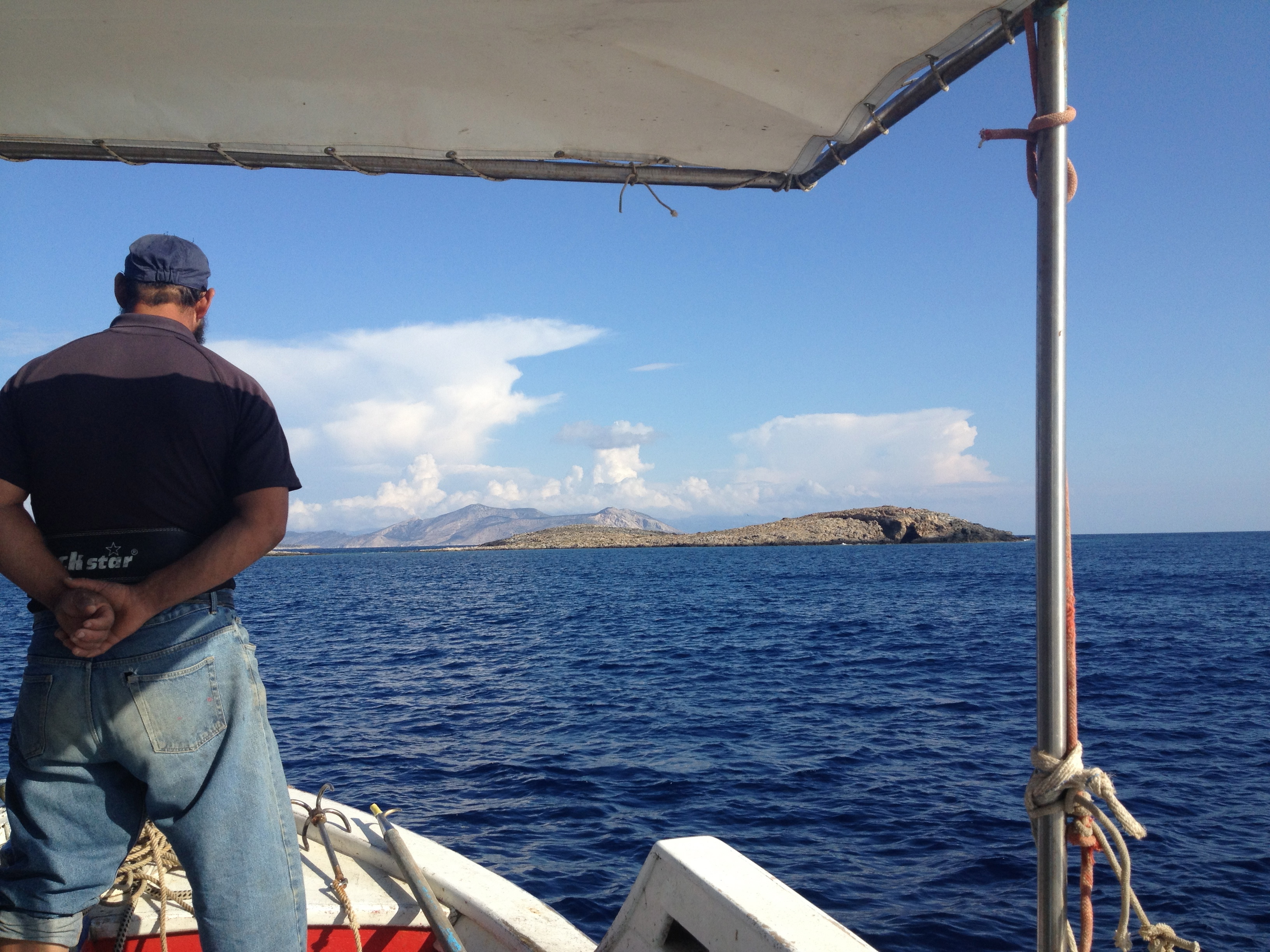 Now a late ferry is manageable, but to make matters worse, the ferry arrived at a port on the north end of the island and the next morning we were set to meet two fisherman to bring us to the small islands of interest all the way at the south tip of the island – over an hour’s drive away. We woke up early and set off to be there by 8:00. After a beautiful hour’s drive on switchbacks up steep cliffs overlooking the ocean, we made it! All would have been perfect if I’d not been so tired behind the wheel. I’m looking forward to doing more driving on Amorgos when I can really enjoy the scenery.
