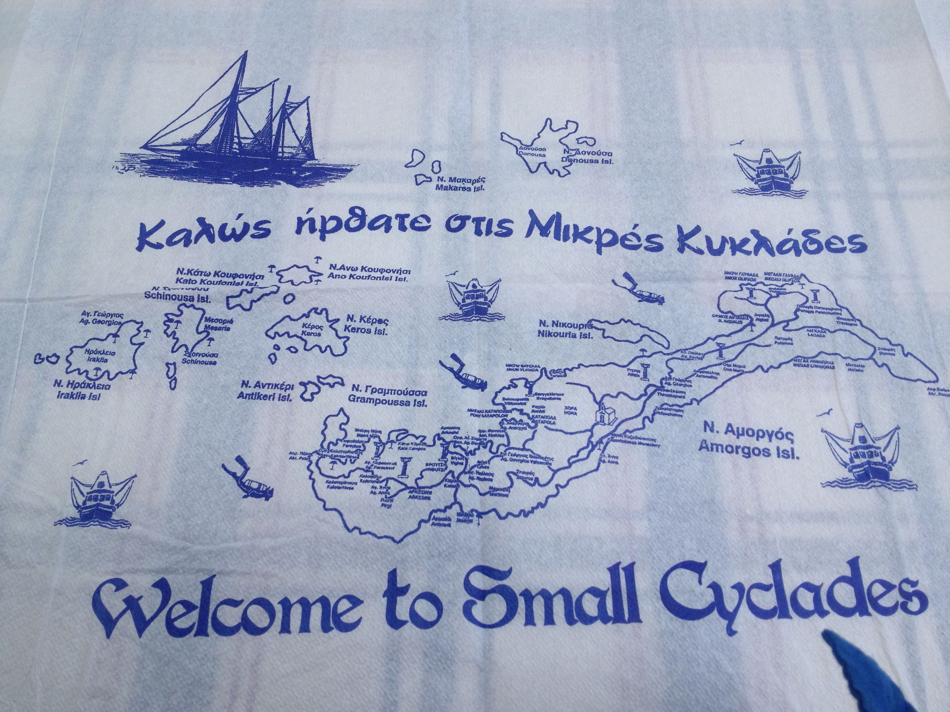 (I like embedding google maps, but this tablecloth on Amorgos from lunch is just too perfect. The long island to the east is Amorgos. You can see on the west coast is Nikouria – that was our afternoon destination. In the south and west you almost make out several small islands very close to shore. Those were our morning destinations.)