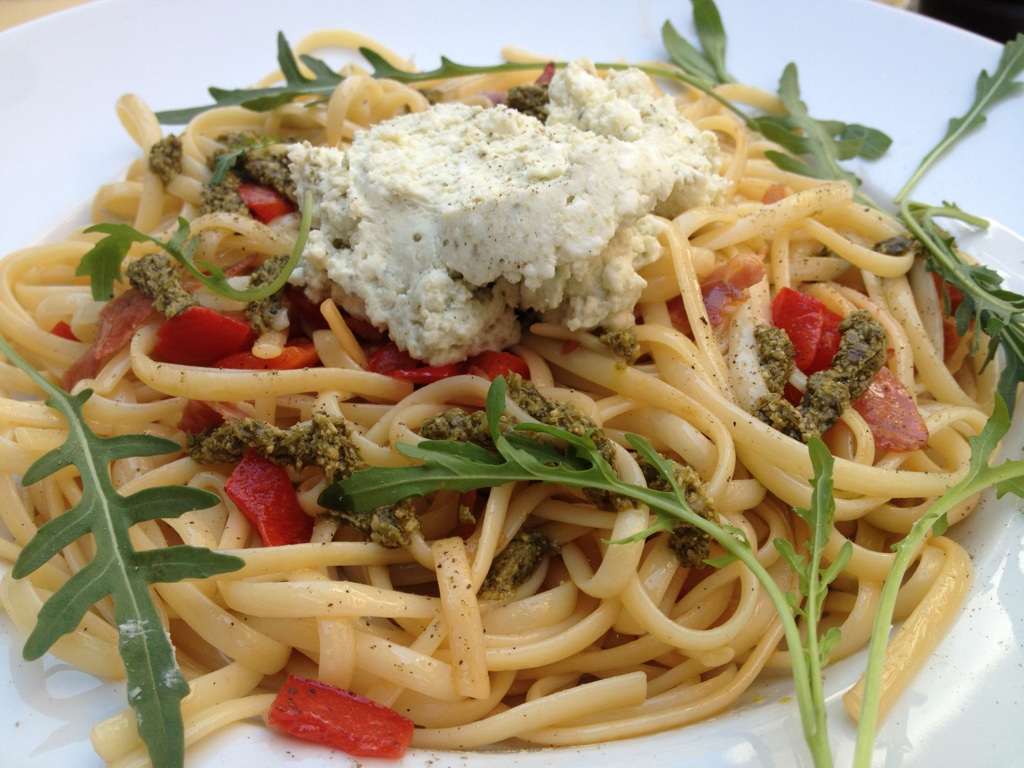 That’s linguini with roasted red peppers, arugula, and prosciutto topped with pesto, cheese, and lime juice. Yum!