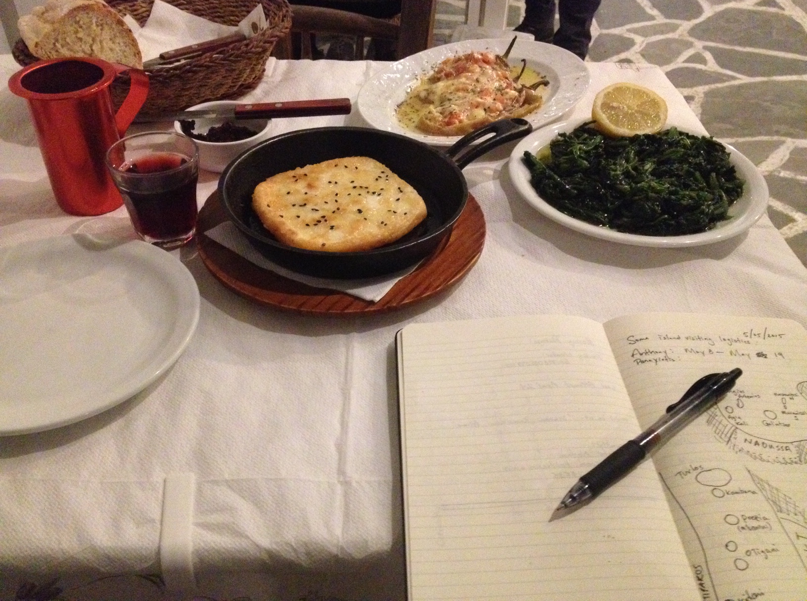 This really isn’t supposed to be a food and scenery blog, but I can’t help another good look at dinner. That’s horta (boiled weeds) – one of my favorites (also, click that link. The blog author and commenters are great). Some stuffed peppers (stuffed with melted cheese and tomatoes). Fried Naxian cheese on a skillet – super delicious! And some local wine… palatable but more sentimental than scrumptious. The notebook was very intentionally included to prove that I really am hard at work! Logistics are just about (finally!) sorted and I’m going to hit the road tomorrow on the lookout for lizards.